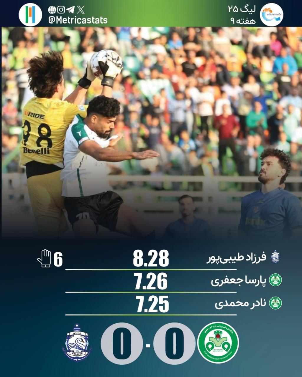 فرزاد طیبی پور با 6 مهار موفق کلینشیت شد تا به صورت مشترک در صدر جدول بیشترین کلینشیت در این فصل قرار گیرد. این بازیکن با نمره متریکا 8.28 بهترین بازیکن زمین شد.