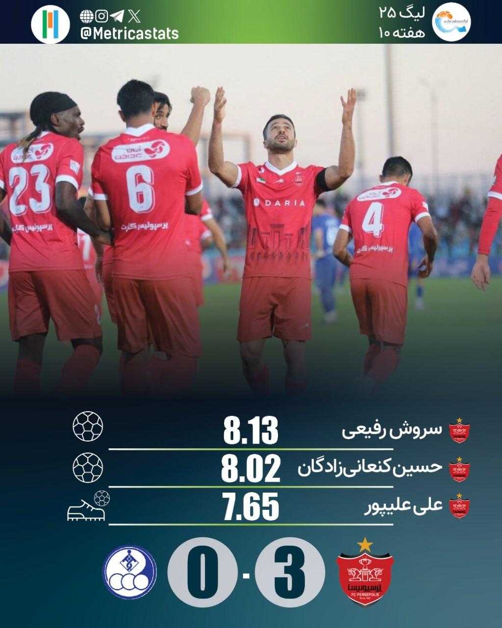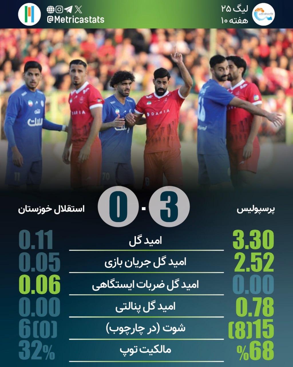 متریکا؛ مرجع آماری فوتبال ایران- پرسپولیس به قاطعترین پیروزی خود برابر استقلال خوزستان در تاریخ لیگ برتر دست یافت. پرسپولیس در 5 تقابلی که پس از بازگشت استقلال خوزستان به لیگ برتر داشته تنها در 2 بازی پیروز شده که 2 دیداری بوده که اوسمار سرمربی پرسپولیس بوده است. استقلال خوزستان صاحب بدترین خط دفاع لیگ شد.