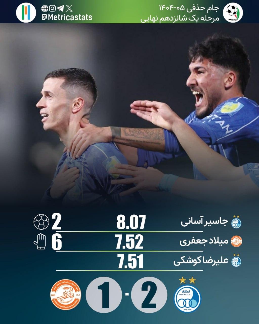 یاسر آسانی با 2 گلی که به ثمر رساند به مجموع 10 گل و پاس گل در تمام رقابتها رسید و بهترین عنصر هجومی استقلال است. این بازیکن با نمره متریکا 8.03 بهترین بازیکن زمین شد.