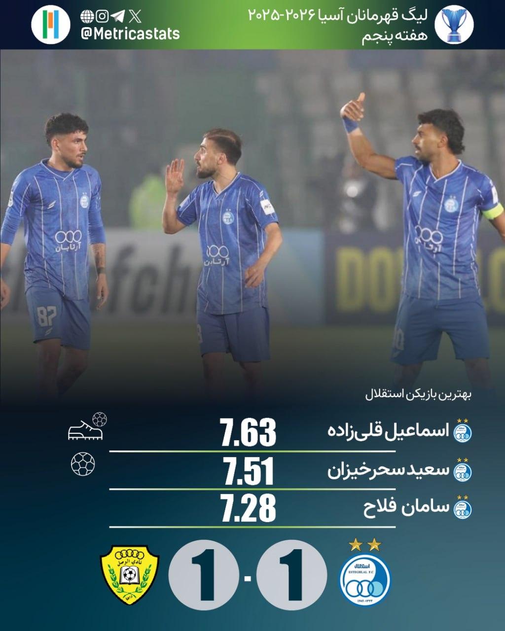 اسماعیل قلیزاده دومین پاسور جوان تاریخ استقلال در رقابتهای آسیایی شد. این بازیکن با نمره متریکا 7.63 بهترین بازیکن استقلال در این دیدار بود.