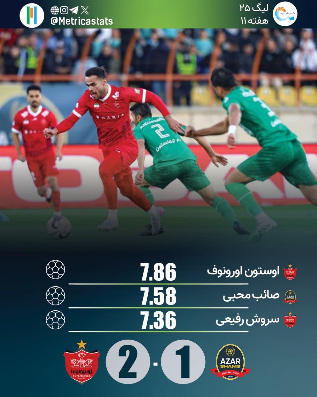 اوستون اورونوف با 13 گل، چهارمین گلزن برتر خارجی تاریخ پرسپولیس شد. این بازیکن با نمره متریکا 7.86 بهترین بازیکن زمین شد.