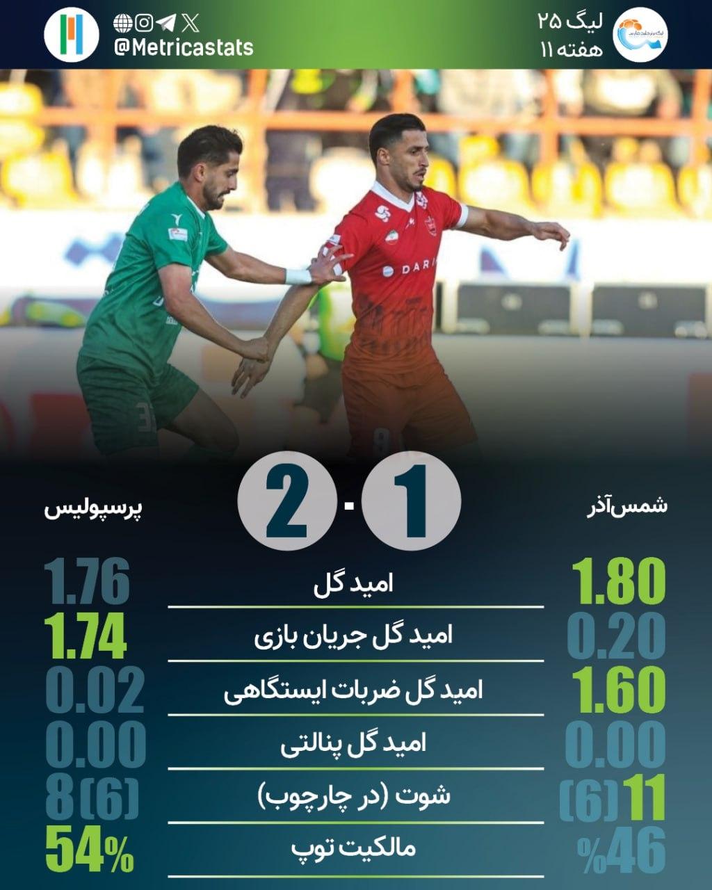 متریکا؛ مرجع آماری فوتبال ایران- پرسپولیس در تمام تقابلهایش با شمسآذر موفق به زدن حداقل 2 گل شده است و در قزوین برابر این تیم هیچ وقت کلینشیت نکرده است. پرسپولیس در 4 بازی اخیر به 3 پیروزی دست یافته است. شمس آذر تنها تیم لیگ است که در خانه به پیروزی نرسیده است. این تیم در 3 بازی آخر به عنوان مهمان با نتیجه یک بر صفر شکست خورده است.