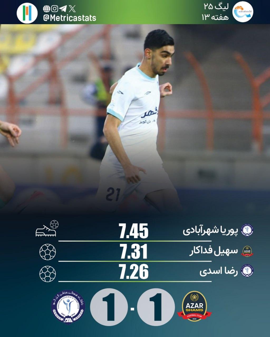 پوریا شهرآبادی اولین پاس گل خود را برای گلگهر داد و با نمره متریکا 7.45 بهترین بازیکن زمین شد.