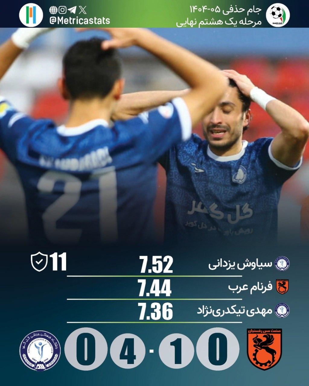 سیاوش یزدانی با 11 عملکرد دفاعی و نمره متریکا 7.52 بهترین بازیکن زمین شد.