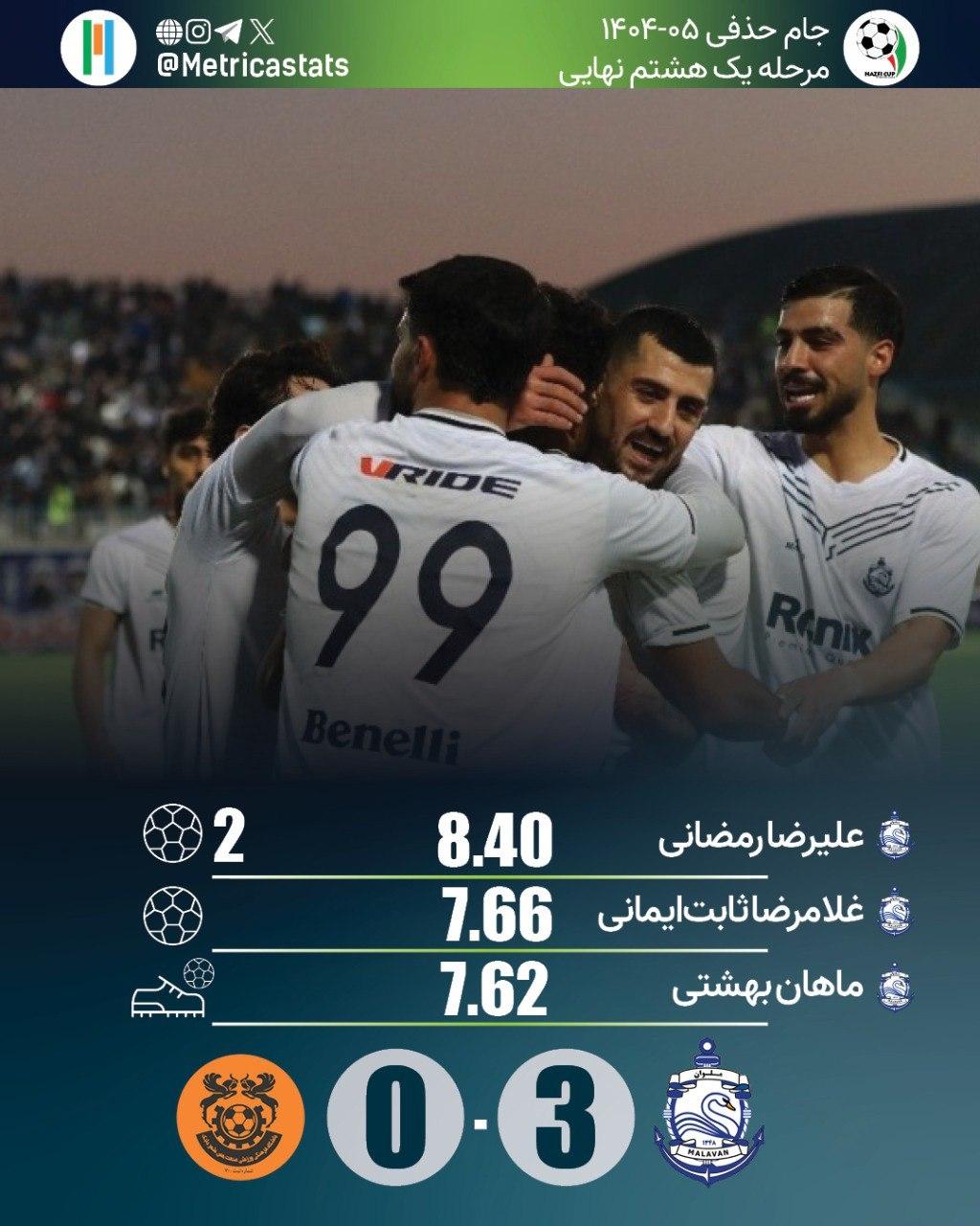 3 گل از 4 گل ملوان در این فصل از جام حذفی توسط علیرضا رمضانی به ثمر رسیده شده است. این بازیکن با نمره متریکا 8.40 بهترین بازیکن زمین شد.