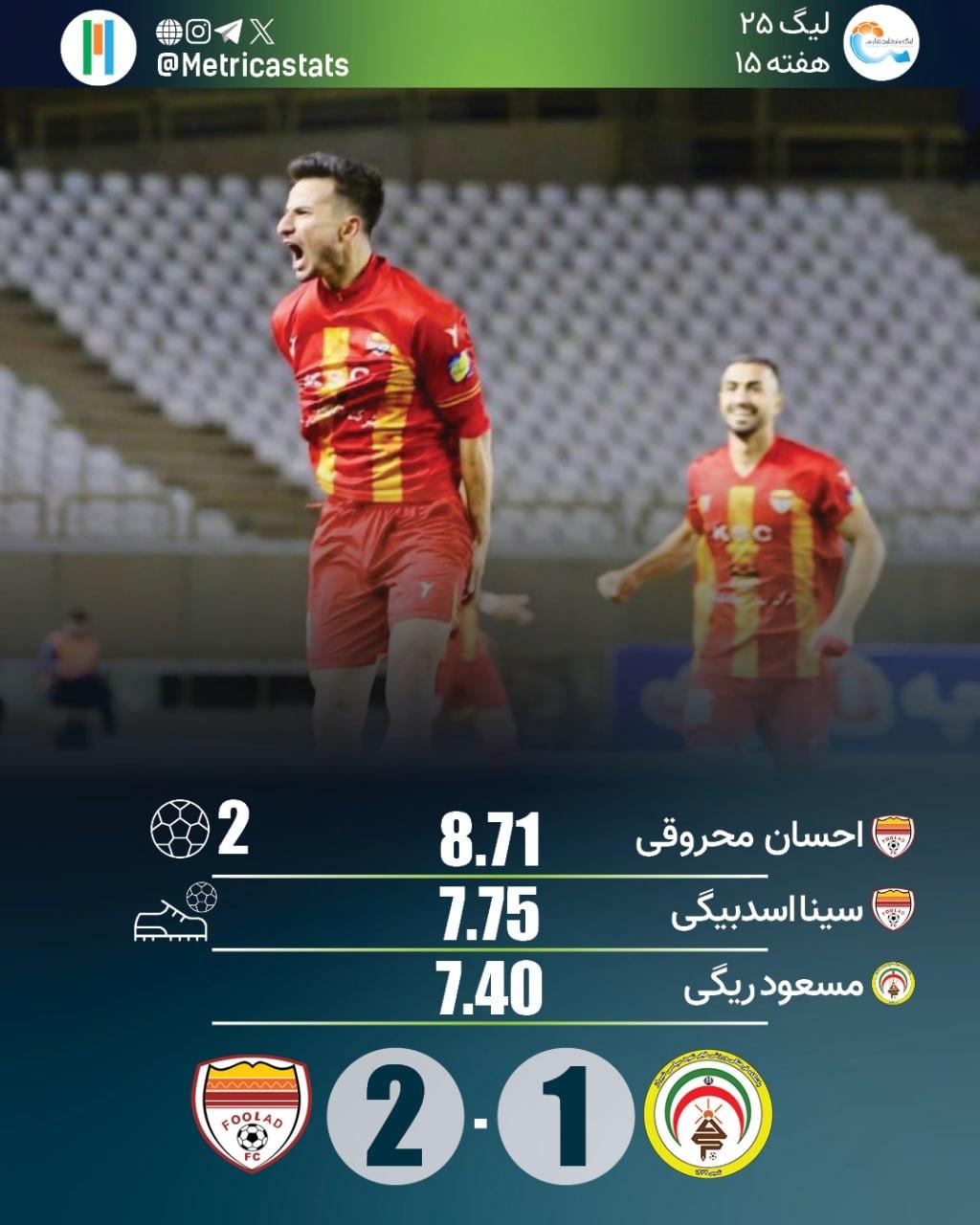 احسان محروقی با 2 گلی که در این بازی زد بهترین گلزن فولاد در این فصل شد. این بازیکن با نمره متریکا 8.71 عنوان بهترین بازیکن زمین را دریافت کرد.
