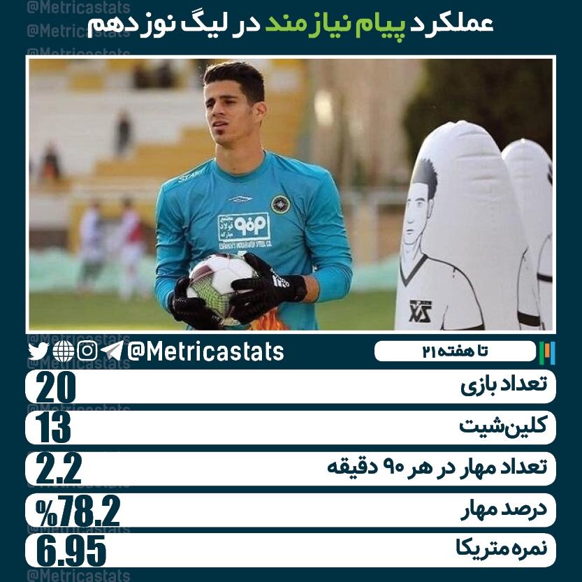 پیام نیازمند بازیکن دوم این تیم با نمره متریکا ۶.۹۵ است. او در ۱۳ بازی از ۲۰ بازی لیگ دروازهاش را بسته نگه داشته، در هر بازی به طور میانگین 2.2 مهار ثبت کرده و درصد مهارهایش نزدیک به ۸۰درصد است. آماری که او را به بهترین دروازهبان لیگ و یکی از بهرین بازیکنان لیک تبدیل میکند.