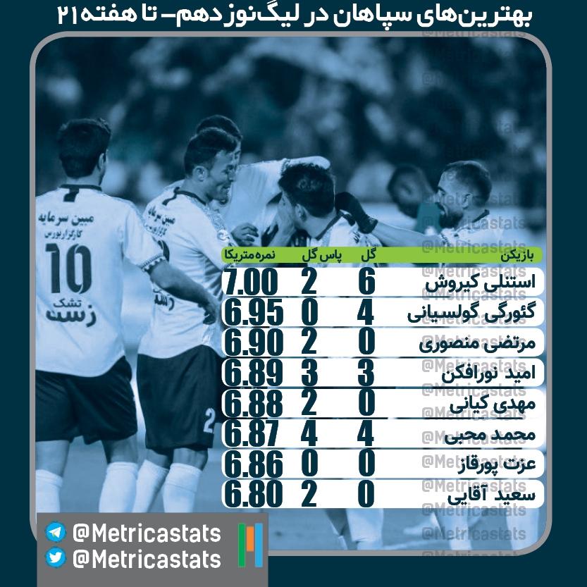 عزت پورقاز (نمره متریکا: 6.86) که بعد از 12 هفته حضور مصدوم و از ترکیب سپاهان خارج شد، هنوز بهترین عملکردهای دفاعی را دارد. شایان مصلح هم با یک پاس گل و نمره متریکای 6.82 نفر دهم بهترین بازیکنان سپاهان است.