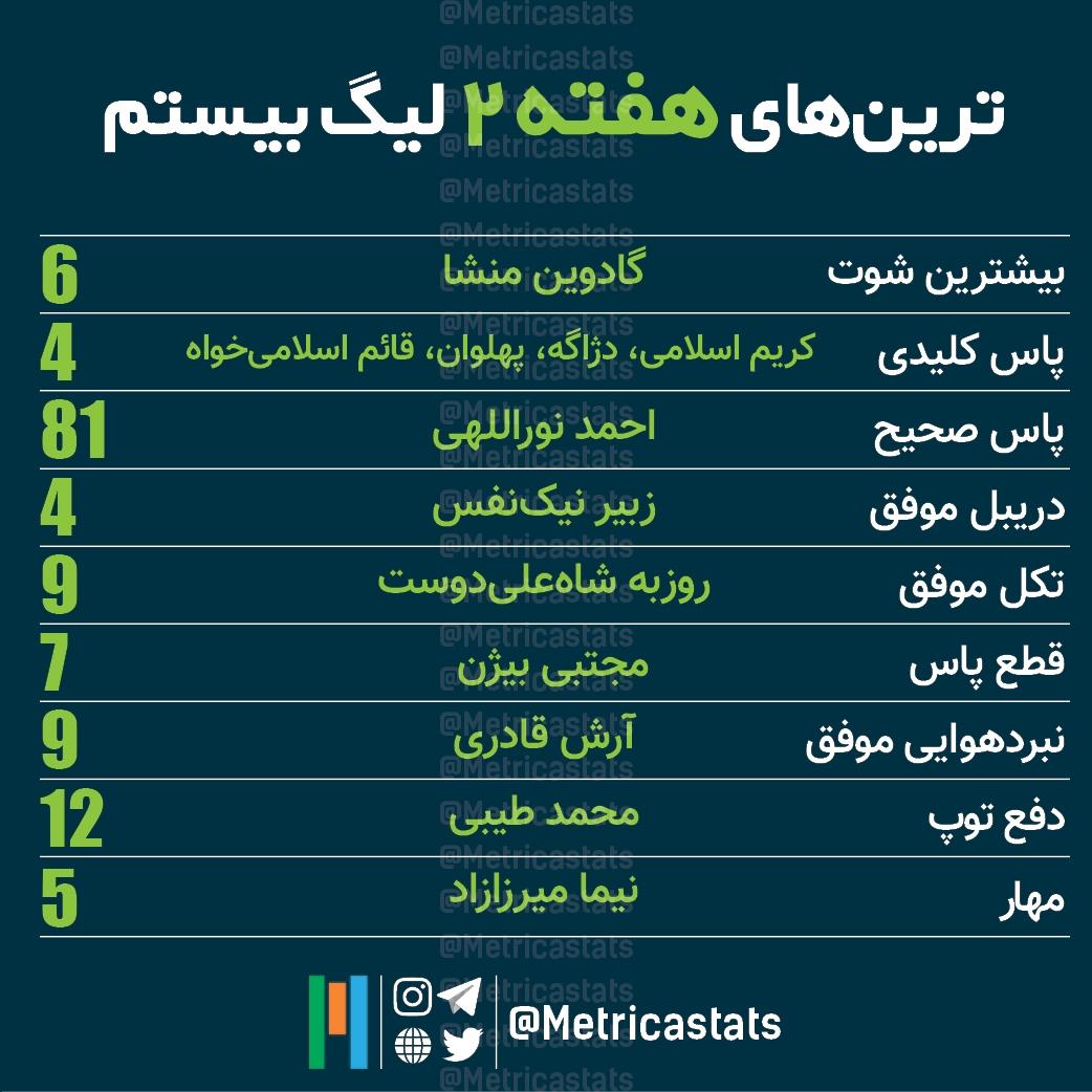 متریکا؛ مرجع آماری و فنی فوتبال ایران- منشا بیشتر از همه شوت زد، نوراللهی بیشترین پاس سالم را داشت، نیکنفس تکنیکیترین بازیکن هفته دوم بود، شاهعلی دوست در تکل موفق (توپگیری)، بیژن در قطع پاس، قادری در نبردهوایی، طیبی در دفع توپ بهترین بودند و میرزازاد بیشترین مهار را داشت.