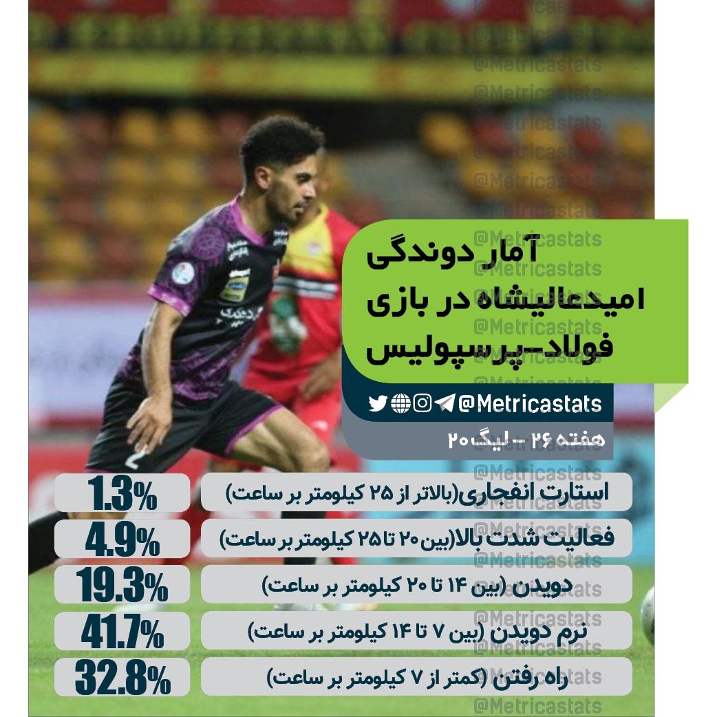 محدوده دوندگی امید عالیشاه، یکی از آمادهترین بازیکنان پرسپولیس در این چند هفته را در بازی مقابل فولاد مشاهده میکنید. عالیشاه بیش از ۶٪ از مسافتی که طی کرد را با سرعت بالای ۲۰ کیلومتر بر ساعت و در محدوده فعالیتهای شدت بالا و استارتهای انفجاری گذراند.