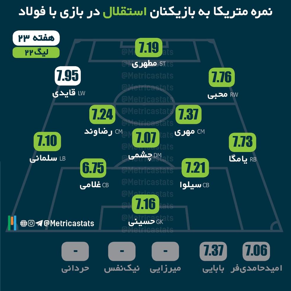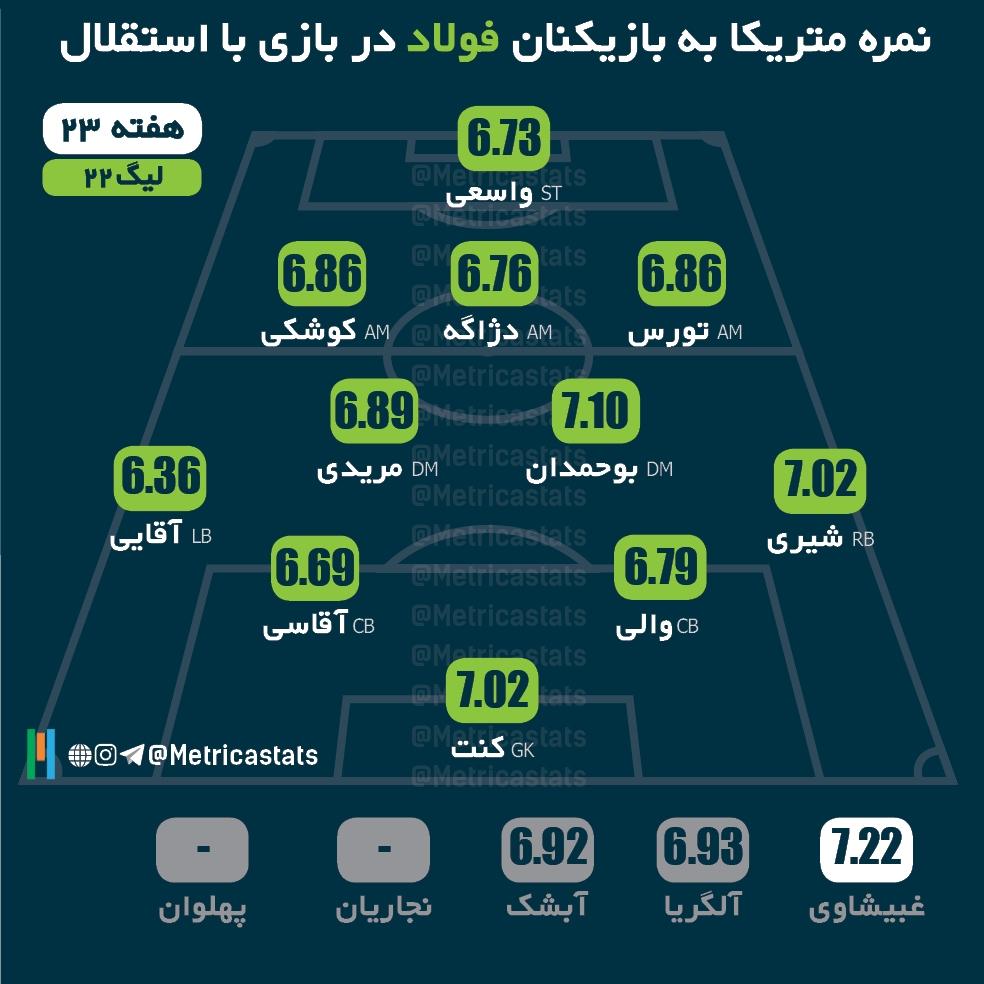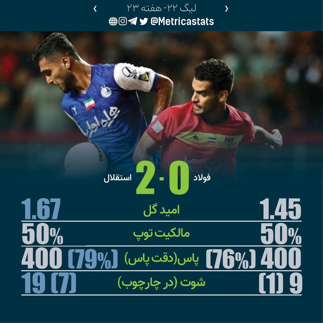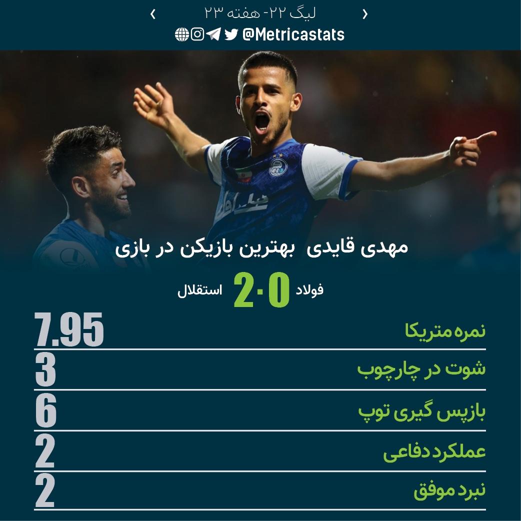 متریکا؛ مرجع آماری فوتبال ایران- امیدگل و مالکیت توپ نشان از یک بازی متعادل میداد ولی استقلال در حملات بسیار پردقت و فولاد بسیار کم دقت بود. مهدی قایدی با یک گل بهترین بازیکن زمین بود