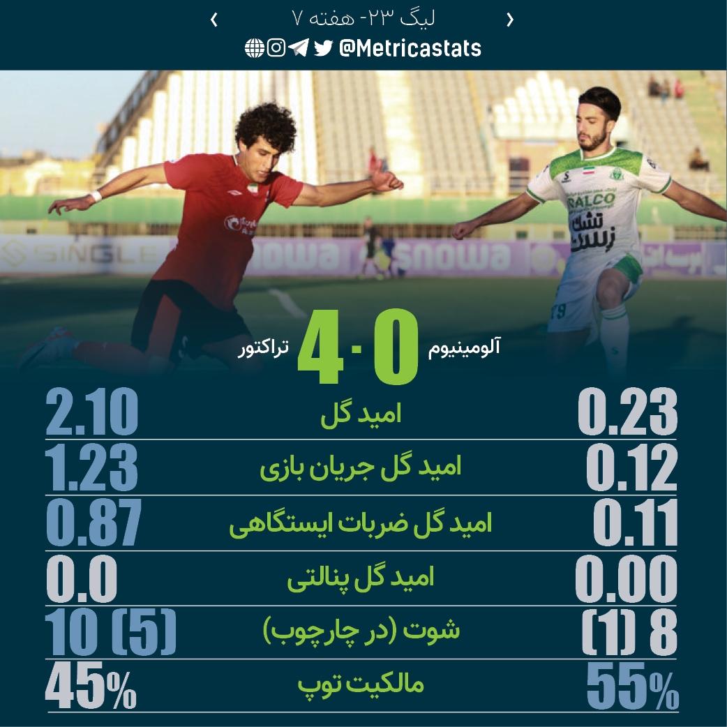 متریکا؛ مرجع آماری فوتبال ایران- تراکتور برای چهارمین بازی پیاپی به پیروزی رسید. تراکتور در این بازی به اندازه تمام بازیهای قبلی خود گل زد، آلومینیوم هم به اندازه کل دیدارهای گذشته خود گل خورد.
