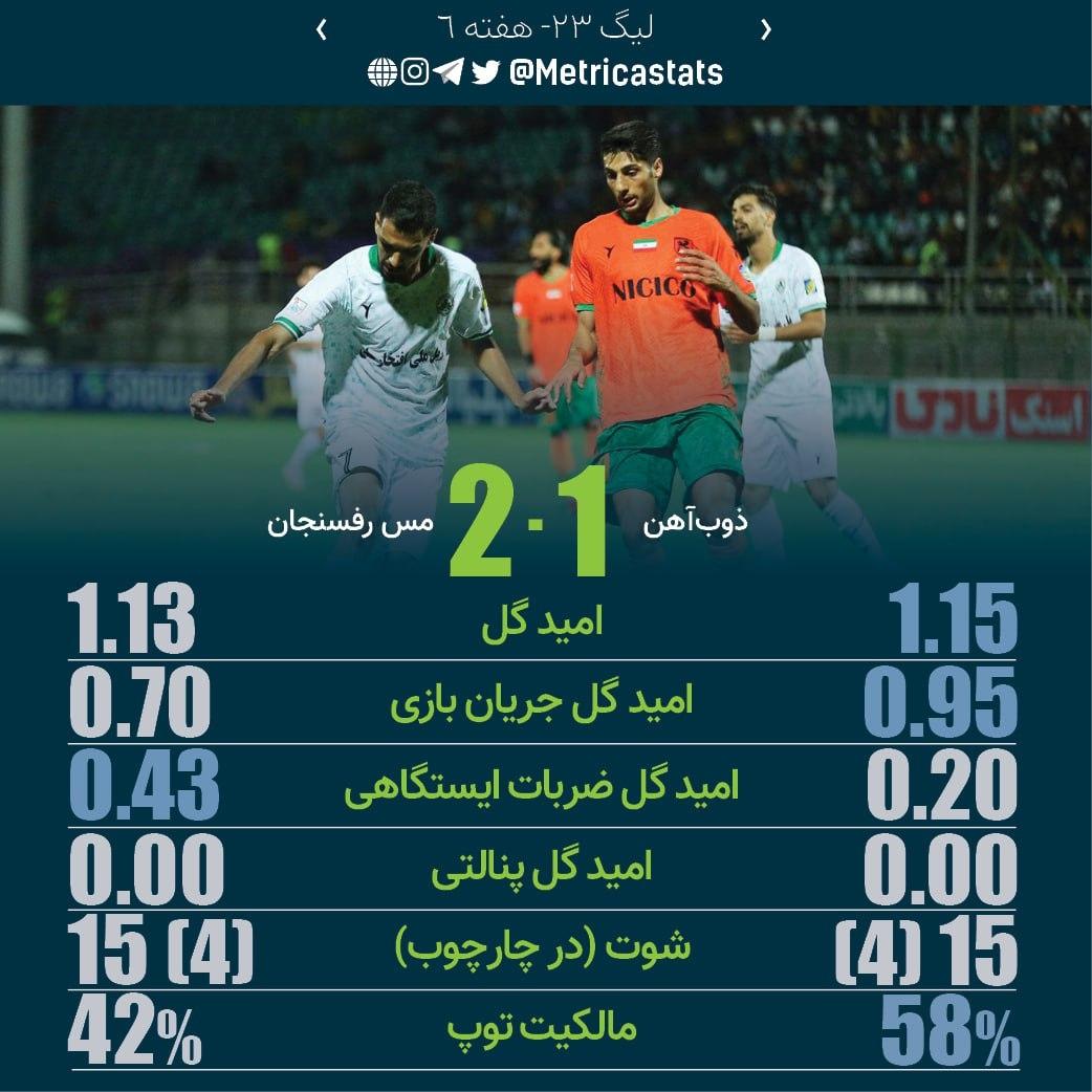 متریکا؛ مرجع آماری فوتبال ایران- دو تیم از نظر امیدگل آمار تقریباً برابری داشتند ولی مس رفسنجان از موقعیتها توانست بهتر استفاده کند. این چهارمین پیروزی مس رفسنجان برابر ذوبآهن در لیگ برتر است و هیچ تیمی را در این مسابقات بیشتر از این شکست نداده اس