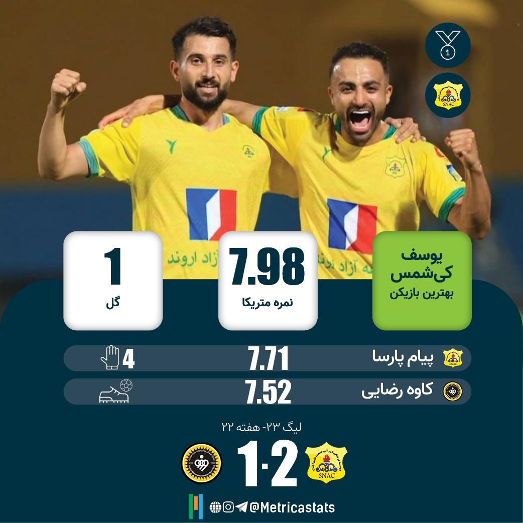⭐️ یوسف کی شمس ۳ شوت زد که ۲ شوت در چارچوب بود که از این ۲ شوت یک شوت گل شد و شوت دیگر در بازگشت وارد دروازه سپاهان شد. این بازیکن با نمره متریکا 7.98 عنوان بهترین بازیکن زمین را کسب کرد.
