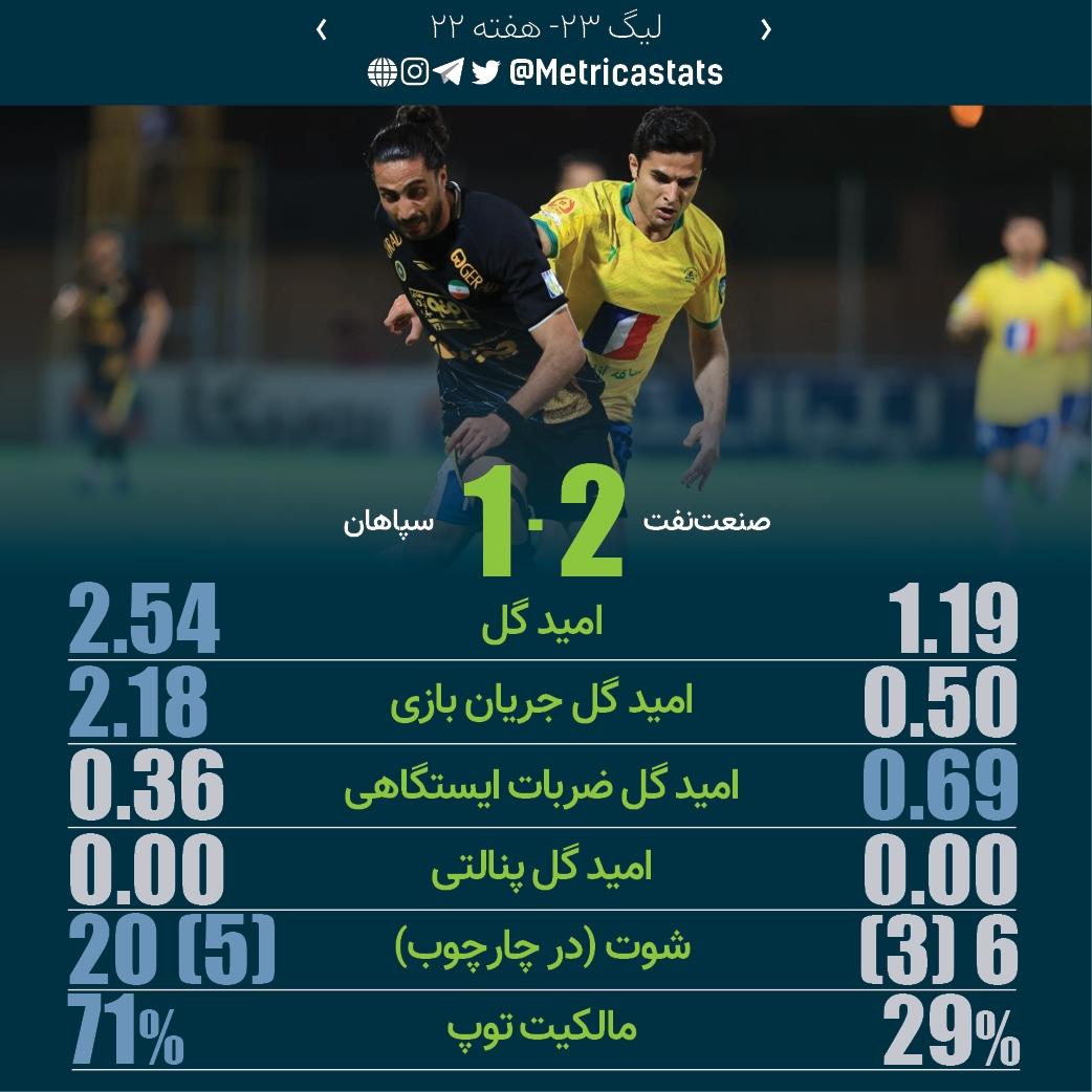 متریکا؛ مرجع آماری فوتبال ایران- صنعت نفت تنها تیم بدون برد بازیهای خانگی برای اولین بار به عنوان میزبان برنده شد. این تیم پس از ۱۱ بازی در لیگ به پیروزی رسید. این بازی تقابل بهترین خط حمله و بدترین خط دفاع لیگ بود و نتیجهای به دست آمد که بر اساس امیدگل می توانست برعکس باشد. سپاهان برای اولین بار از لیگ هفدهم در ۳۰ دقیقه ابتدایی ۲ گل دریافت کرد که آن بازی هم در آبادان برابر صنعت نفت با مربیگری فراز کمالوند بود.