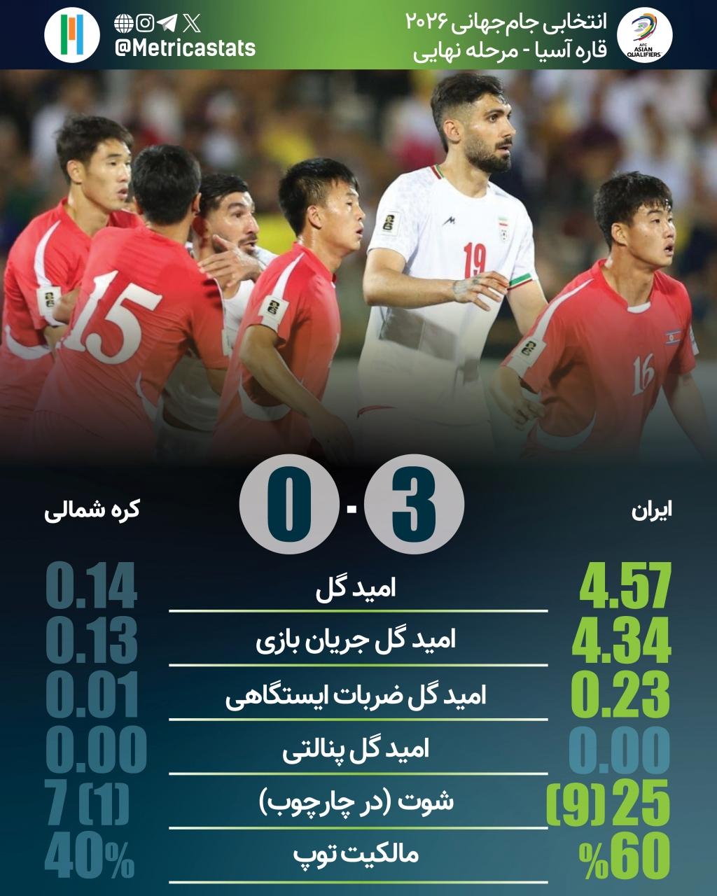 متریکا؛ مرجع آماری فوتبال ایران- تیم ملی با رکورد بهترین پیروزی تاریخ خود برابر کرهشمالی برابر شد. ایران در این بازی بالاترین امیدگل 4 سال گذشته خود را به ثبت رساند. ایران در 12 تقابل گذشته با کرهشمالی به 11 پیروزی دست یافته است.