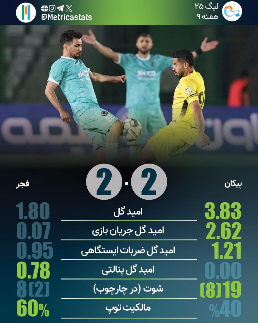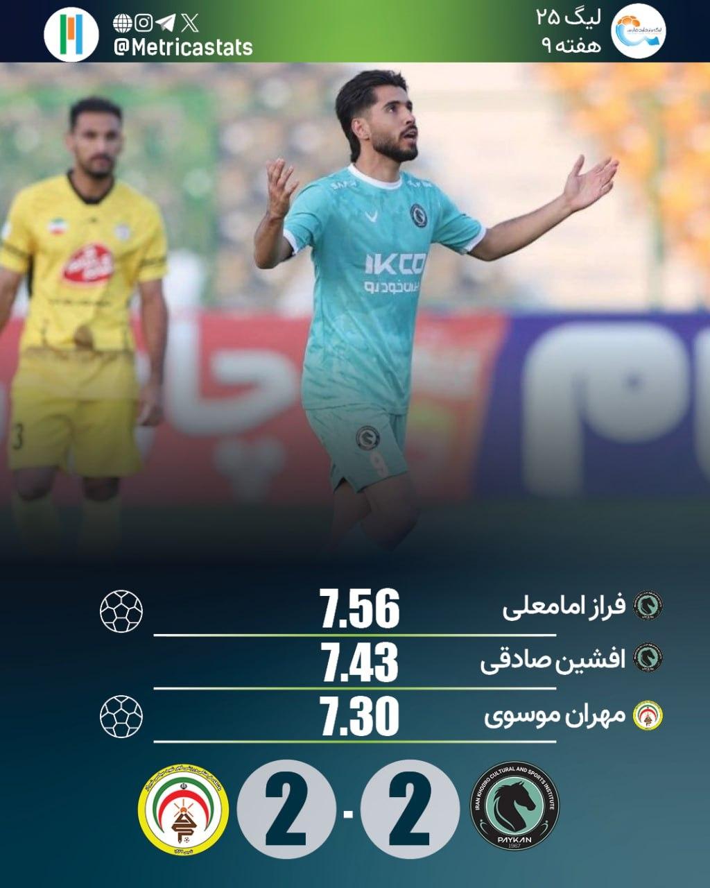 ⭐️ فراز امامعلی با گلزنی در این بازی به صورت مشترک در رده چهارم بهترین گلزنان پیکان در تاریخ لیگ برتر قرار گرفت. این بازیکن با نمره متریکا 7.56 بهترین بازیکن زمین شد.
