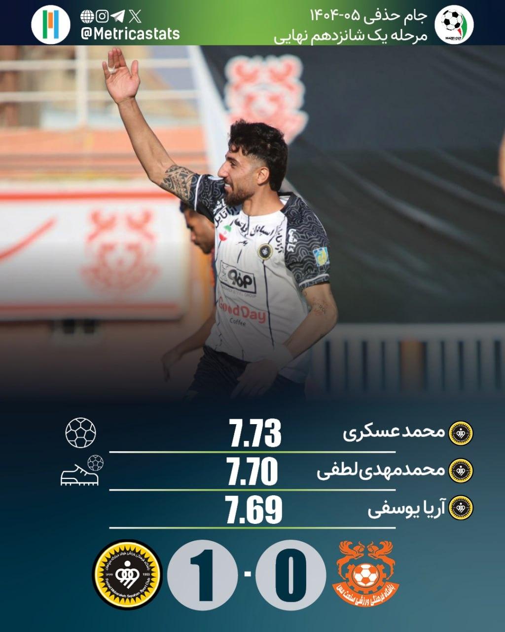 محمد عسگری برای دومین بازی متوالی موفق به گلزنی برای سپاهان شد و با نمره متریکا 7.73 بهترین بازیکن زمین شد.