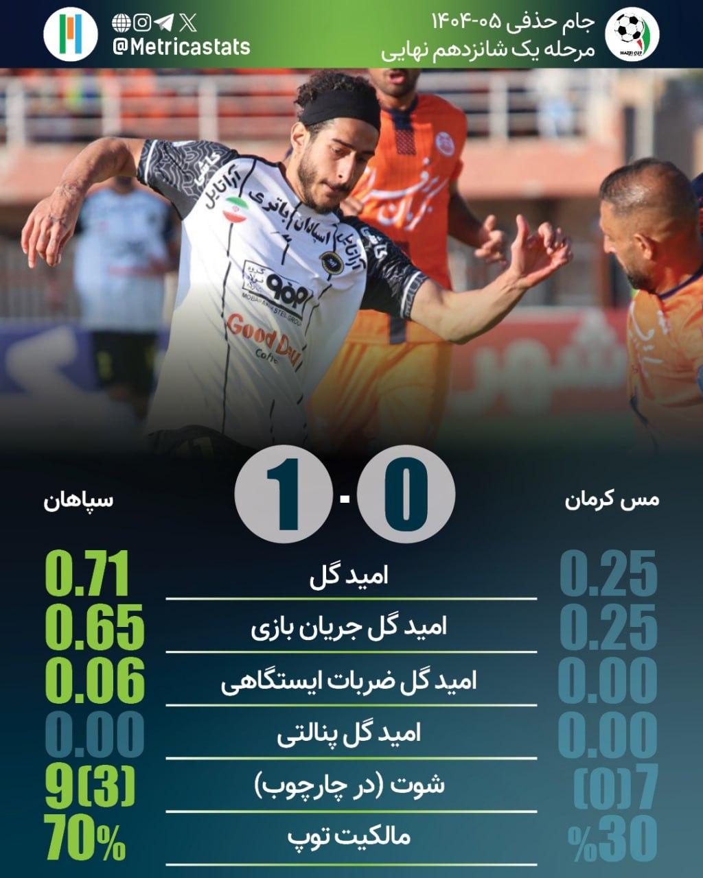 متریکا؛ مرجع آماری فوتبال ایران- سپاهان در 15 بازی اخیر جام حذفی در 90 دقیقه شکست نخورده است. سپاهان در هر 3 تقابل با مس کرمان در جام حذفی، موفق به حذف این تیم شده است. سپاهان برای هشتمین فصل متوالی به مرحله یک هشتم نهایی جام حذفی راه یافت.