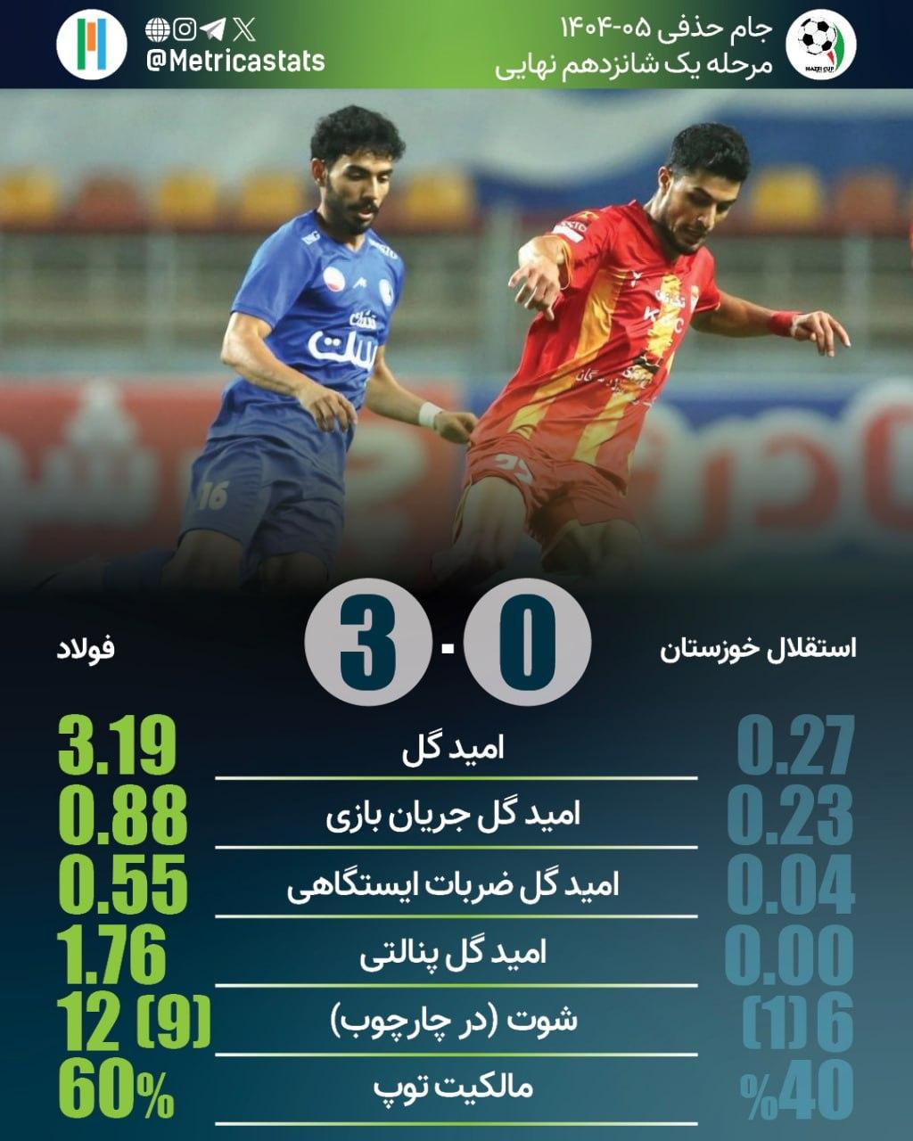 متریکا؛ مرجع آماری فوتبال ایران- فولاد خوزستان رکورد بهترین پیروزی تاریخ خود برابر استقلال خوزستان را تکرار کرد. استقلال خوزستان در 6 بازی گذشته در تمام رقابتها به طور متوسط در هر بازی 2 گل خورده است. استقلال خوزستان 7 فصل است که به مرحله یک هشتم نهایی جام حذفی نرسیده است.