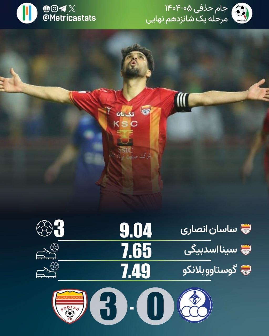 ساسان انصاری برای سومین بار با پیراهن فولاد موفق به هتتریک شد و با رکورد تاریخ این باشگاه برابر شد. این بازیکن با نمره متریکا 9.04 بهترین بازیکن زمین شد.