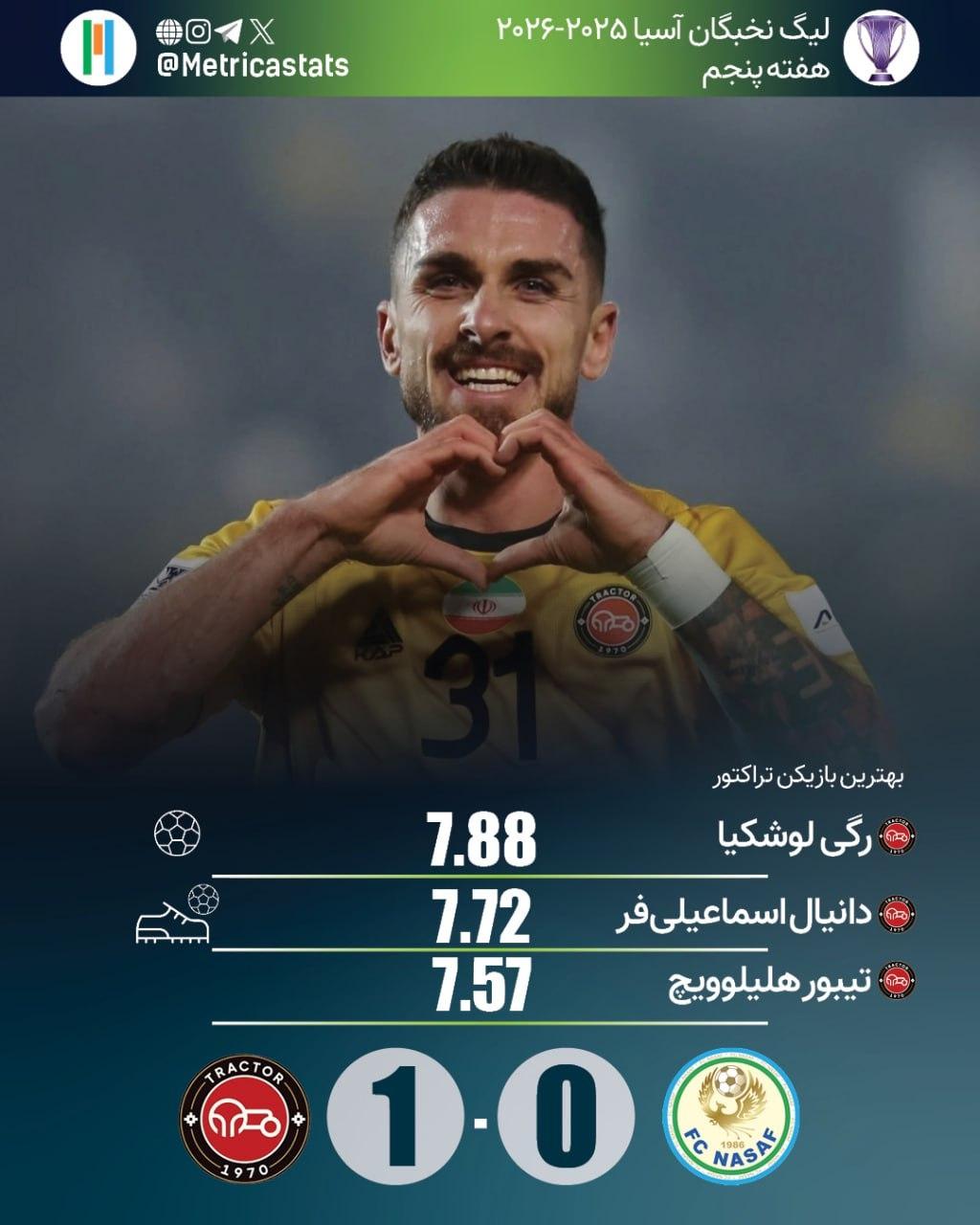 رگی لوشکیا 3 گله شد و در رده دوم بهترین گلزنان لیگ نخبگان قهرمانان آسیا قرار گرفت. این بازیکن با نمره متریکا 7.88 بهترین بازیکن تراکتور در این دیدار بود.