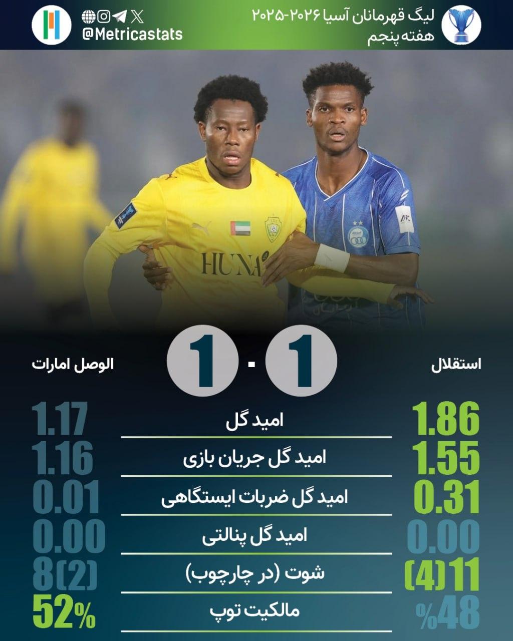 متریکا؛ مرجع آماری فوتبال ایران- استقلال در 7 تقابل اخیر برابر تیمهای اماراتی صاحب یک پیروزی شده است. استقلال بر اساس امیدگل میتوانست یک گل بیشتر در این بازی به ثمر رساند. استقلال در 8 بازی گذشته در تمام رقابتها موفق به گلزنی شده است.