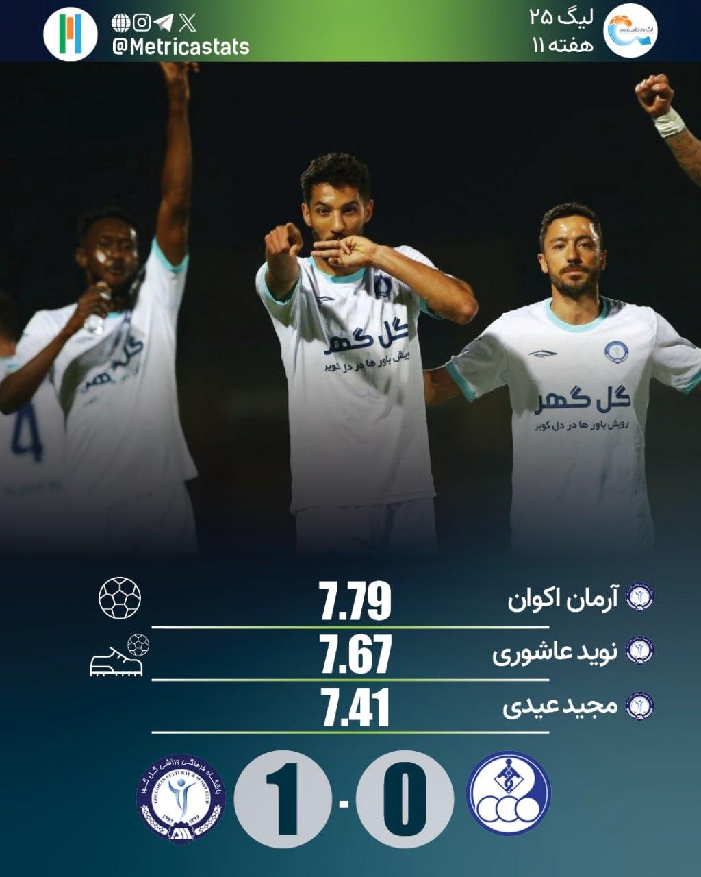آرمان اکوان تنها گل بازی را به ثمر رساند و برای ششمین بار در 4 فصل اخیر عنوان بهترین بازیکن زمین را کسب کرد. این بازیکن از متریکا نمره 7.79 گرفت.