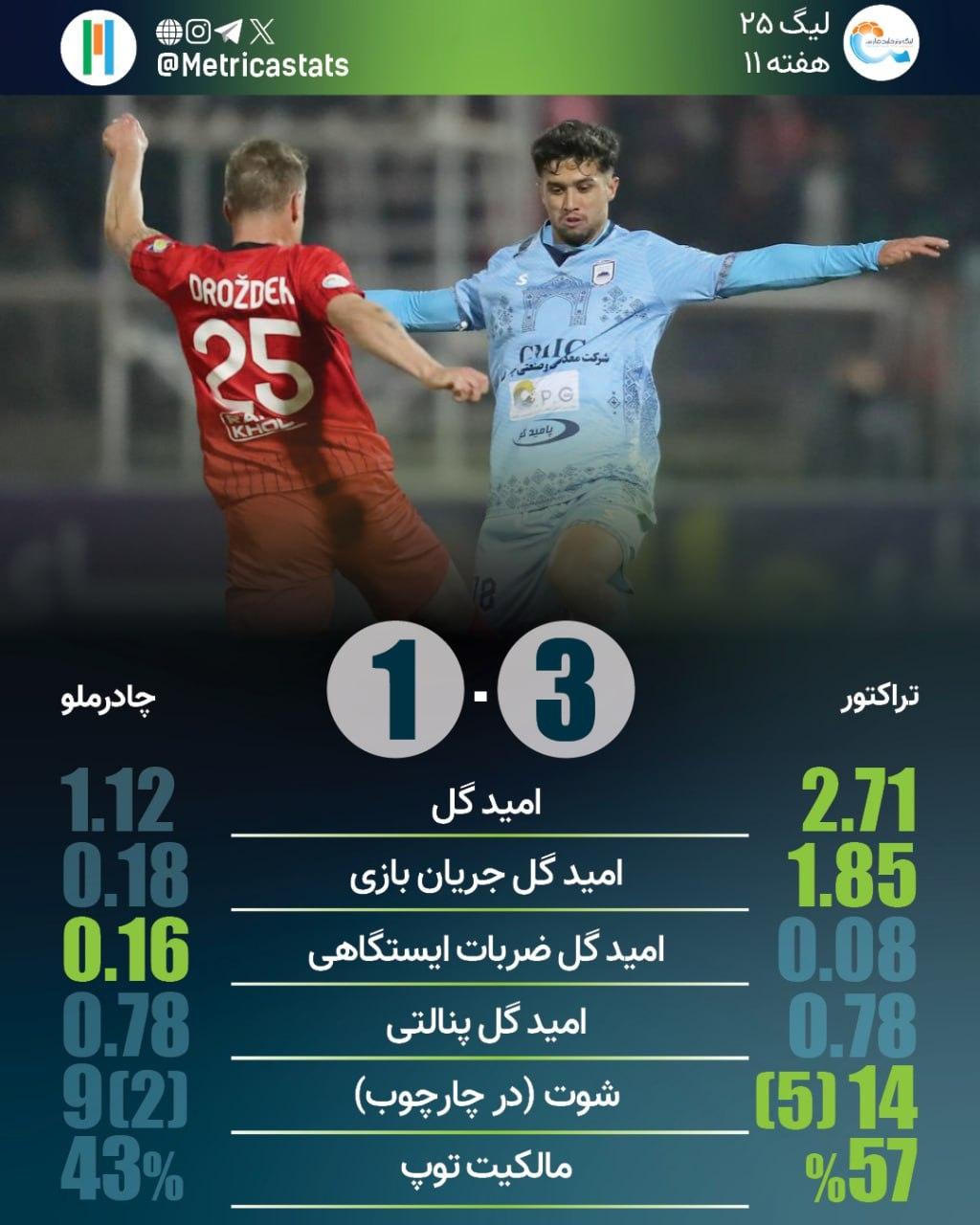 متریکا؛ مرجع آماری فوتبال ایران- تراکتور برای سومین بازی متوالی در لیگ برتر موفق به بسته نگه داشتن دروازهاش نشد. چادرملو از هیچ تیمی بیشتر از تراکتور در لیگ برتر گل نخورده است. تراکتور در 9 بازی اخیر در لیگ در 8 مسابقه امیدگل بالای یک ثبت کرده است.