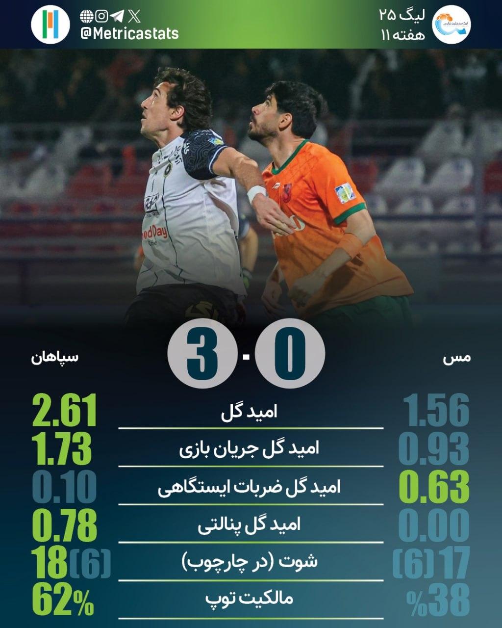 متریکا؛ مرجع آماری فوتبال ایران- سپاهان به چهارمین پیروزی متوالی در لیگ دست یافت. مس رفسنجان از هیچ تیمی بیشتر از سپاهان در لیگ برتر گل نخورده است. رسول خطیبی در 11 تقابل با سپاهان هیچ وقت به پیروزی نرسیده است.