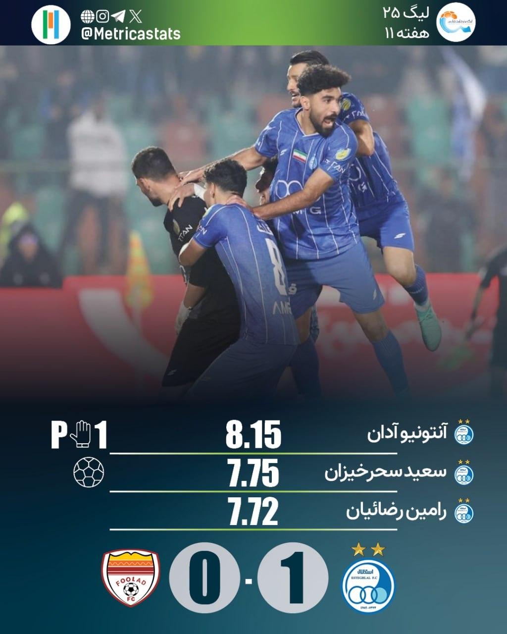 آنتونیو آدان، سیامین پنالتی مهار شده استقلال در تاریخ لیگ برتر را به نام خود ثبت کرد. این دروازه بان با نمره متریکا 8.15 بهترین بازیکن زمین شد.