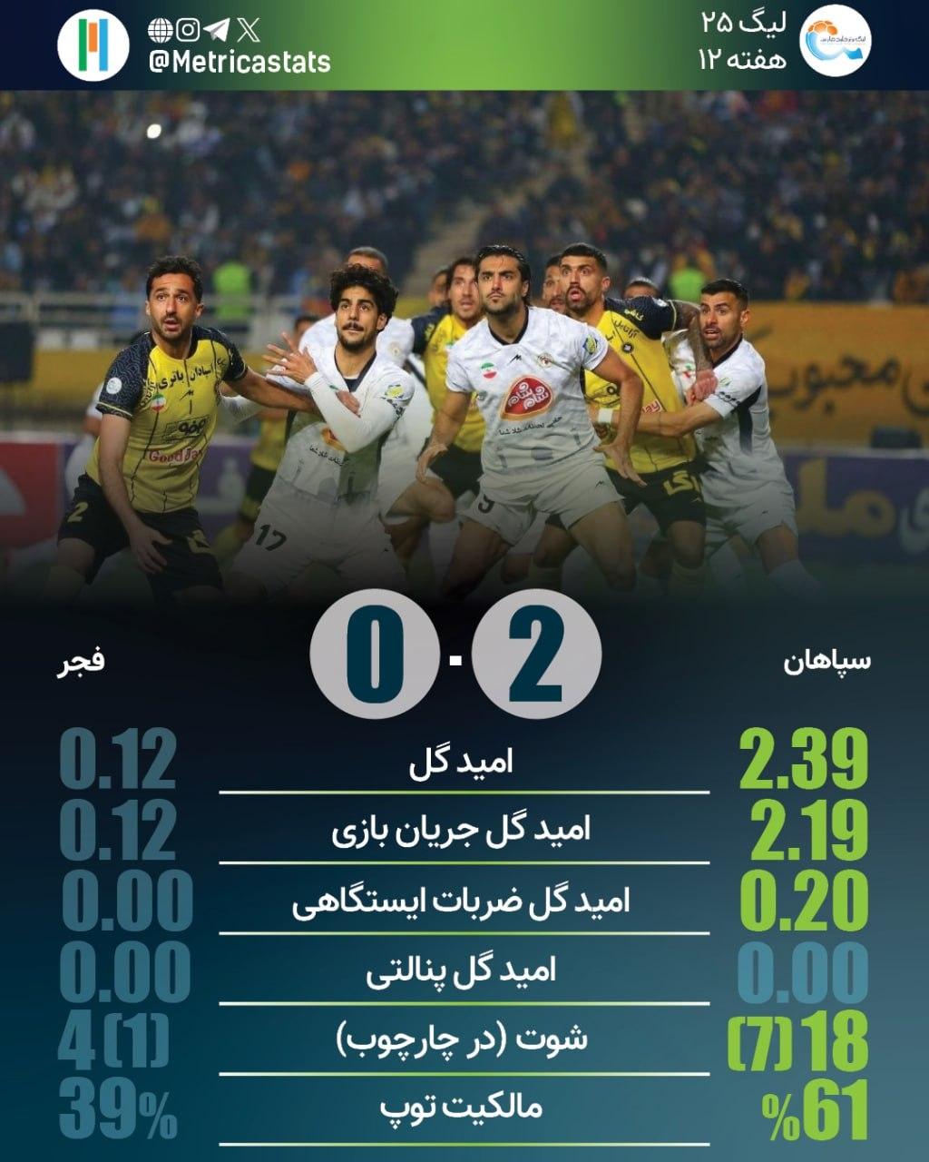 متریکا؛ مرجع آماری فوتبال ایران- سپاهان تنها تیم این فصل است که موفق به 5 پیروزی متوالی شده است. فجر سپاسی 5 بازی است که موفق به بسته نگه داشتن دروازه نشده است. سپاهان در 3 تقابلی که با مربیگری نویدکیا با فجر داشته به پیروزی 2-0 رسیده است.