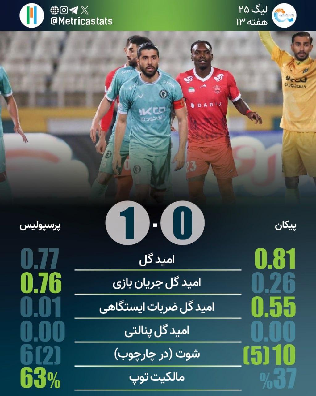 متریکا؛ مرجع آماری فوتبال ایران- پرسپولیس در 14 تقابل اخیر با پیکان 13 بار به پیروزی رسیده است. پرسپولیس 29 بار در لیگ برتر پیکان را شکست داده که این بیشترین تعداد برد یک تیم برابر تیم دیگر در تاریخ لیگ برتر است. پرسپولیس در 6 مصاف قبلی با پیکان تنها یک گل دریافت کرده است. سعید دقیقی که در هر 5 رویارویی برابر پرسپولیس شکست خورده برای اولین بار در گلزنی برابر این تیم ناکام ماند.