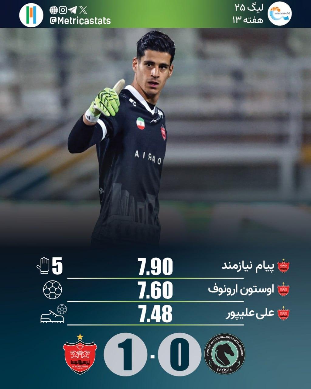 پیام نیازمند با کلینشیت به تنهایی رکورددار این فصل شد. این دروازهبان برای بسته نگه داشتن دروازهاش 5 مهار داشت و با نمره متریکا 7.90 بهترین بازیکن زمین شد.