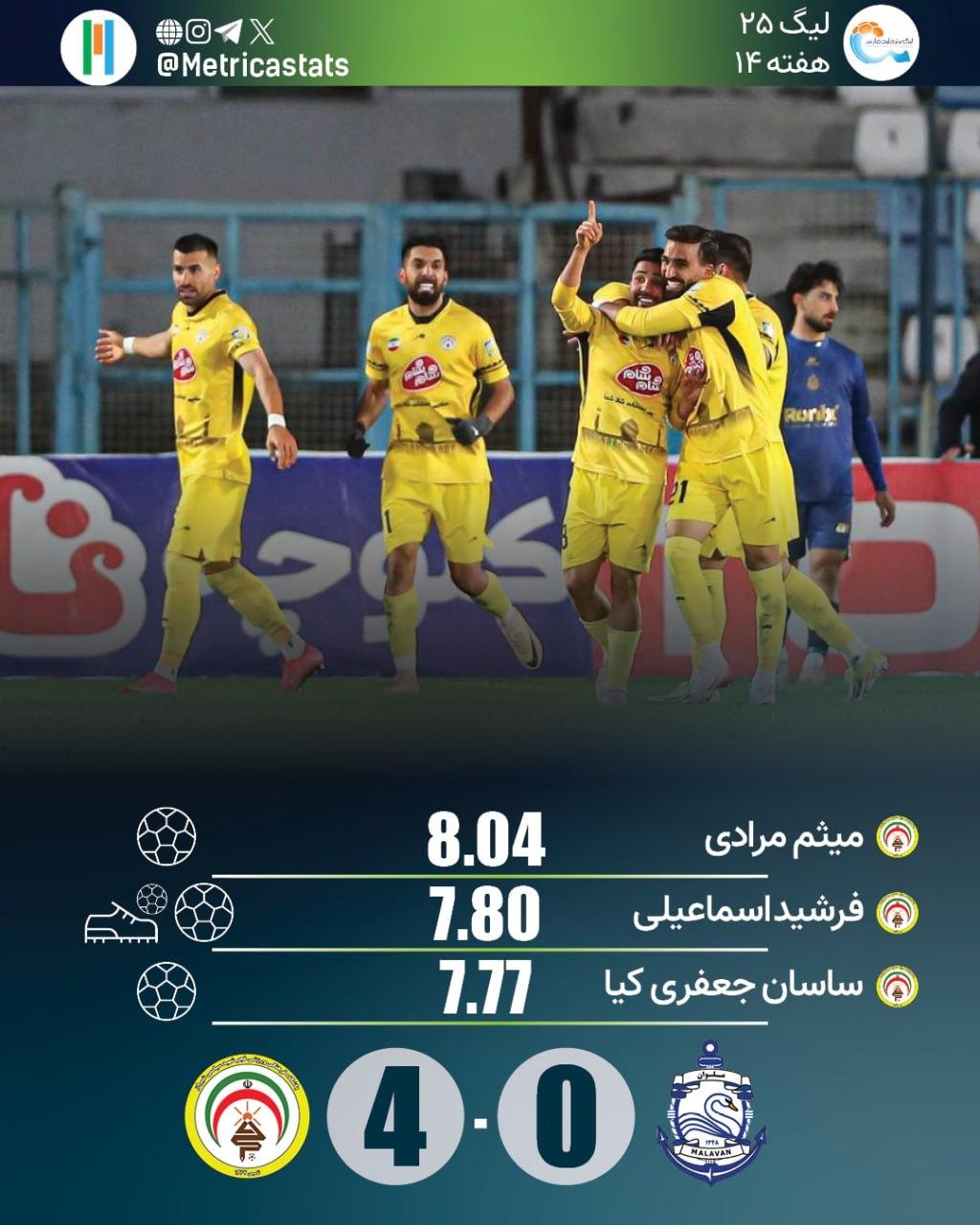 میثم مرادی در این بازی هم گل زد و هم پنالتی گرفت و با نمره متریکا 8.04 بهترین بازیکن زمین شد.