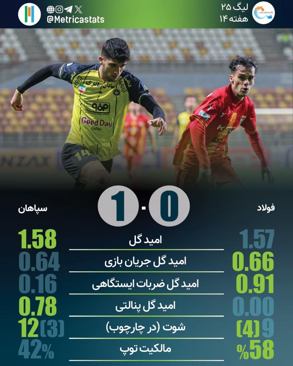 متریکا؛ مرجع آماری فوتبال ایران- سپاهان به هفتمین پیروزی پیاپی خود در این فصل دست یافت. این تیم هر بار در یک فصل موفق به ثبت چنین آماری شده به قهرمانی رسیده است. فولاد خوزستان که بدترین خط حمله لیگ را دارد، 4 بازی متوالی است که موفق به گلزنی نشده است. سپاهان تنها تیمی است که در تمام بازیهای خارج از خانه گل زده است.