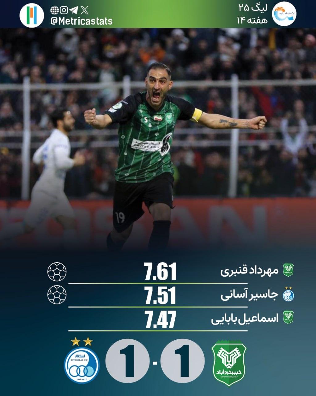 مهرداد قنبری با زدن 3 گل بیش از هر تیمی به استقلال گل زده است. این بازیکن با نمره متریکا 7.61 بهترین بازیکن زمین شد.